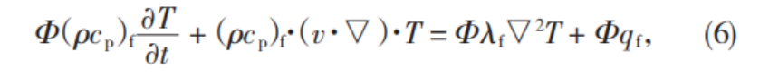 兩種能量增加帶來的溫升是基于多孔介質(zhì)材料內(nèi)的固體部分。假設(shè)固體部分的密度表示為ρs,其比熱容表示為cs。假定研究對象熱物性參數(shù),如比熱容、導(dǎo)熱系數(shù)等,不受到時(shí)間和空間改變帶來的影響,多孔介質(zhì)本身始終為各項(xiàng)同性的,并且多孔介質(zhì)材料內(nèi)部細(xì)小孔隙的容積均被流體填充,則有: