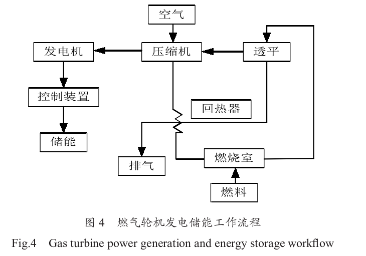 燃?xì)廨啓C(jī)發(fā)電儲能是通過燃料供給系統(tǒng)將天然氣輸送到燃燒室。天然氣在燃燒室內(nèi)與空氣混合燃燒,產(chǎn)生高溫高壓的燃?xì)?。這些高溫高壓的燃?xì)庋杆倥蛎?并流經(jīng)透平葉片, 推動透平旋轉(zhuǎn)。透平葉片通過軸連接到發(fā)電機(jī),透平的旋轉(zhuǎn)帶動發(fā)電機(jī)的轉(zhuǎn)子旋轉(zhuǎn),從而在定子中產(chǎn)生電流,完成電能的轉(zhuǎn)換。最終將電能儲存到儲能系統(tǒng)中,以便在電力需求高峰期或電網(wǎng)出現(xiàn)故障時進(jìn)行釋放和使用。如圖4所示。在燃?xì)廨啓C(jī)發(fā)電儲能過程中,儲能系統(tǒng)可以幫助平衡燃?xì)廨啓C(jī)發(fā)電的輸出波動。燃?xì)廨啓C(jī)的啟動和停止時間較長,且燃料燃燒效率和發(fā)電效率容易受環(huán)境溫度和負(fù)荷變化的影響。通過儲能系統(tǒng)的調(diào)節(jié),可以在短時間內(nèi)補(bǔ)償輸出功率的波動,確保電網(wǎng)的穩(wěn)定運(yùn)行。在負(fù)荷較低時,燃?xì)廨啓C(jī)的效率較低, 部分燃料會被浪費(fèi)。儲能系統(tǒng)可以在這種情況下存儲多余的電能,并在電力需求高峰期釋放,減少燃?xì)廨啓C(jī)的啟動和停止次數(shù),從而提高整體的能源利用效率。