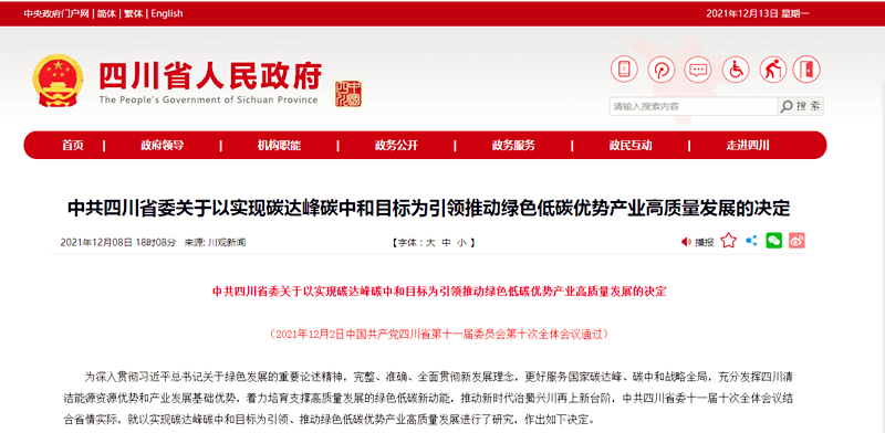 12月8日,中共四川省人民政府在官網(wǎng)發(fā)布了《中共四川省委關(guān)于以實現(xiàn)碳達(dá)峰碳中和目標(biāo)為引領(lǐng)推動綠色低碳優(yōu)勢產(chǎn)業(yè)高質(zhì)量發(fā)展的決定》(以下簡稱《方案》)。
