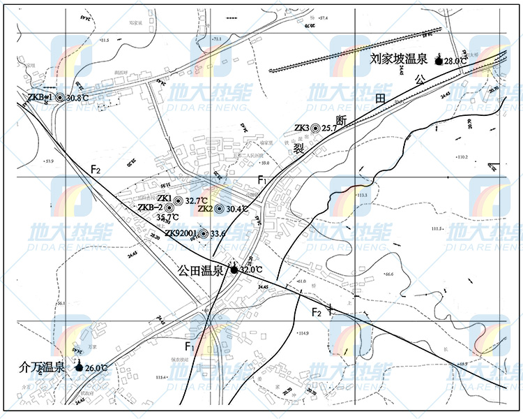 根據(jù)抽水試驗實測涌水量、水溫結(jié)合鉆孔與區(qū)內(nèi)斷裂構(gòu)造的相對位置分析,靠近F2則相對富水,水溫亦升高;且隨著含水層(公田斷裂破碎帶)埋深的增大,揭露的地下水溫也增高;地下水溫度與含水層埋深有關,也和地下水賦水空間與深部熱源溝通程度有關。