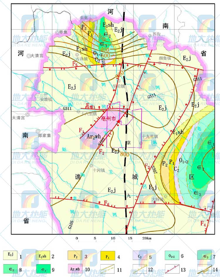 亳州市地層屬于華北地層區(qū)淮河地層分區(qū)淮北地層小區(qū)。區(qū)域地層主要發(fā)育有太古界五河群、下古生界寒武、奧陶、上古生界石炭、二疊系、新生界新近系、古近系和第四系,地表皆為第四系覆蓋。對地熱與供水意義較大的地層如下:
