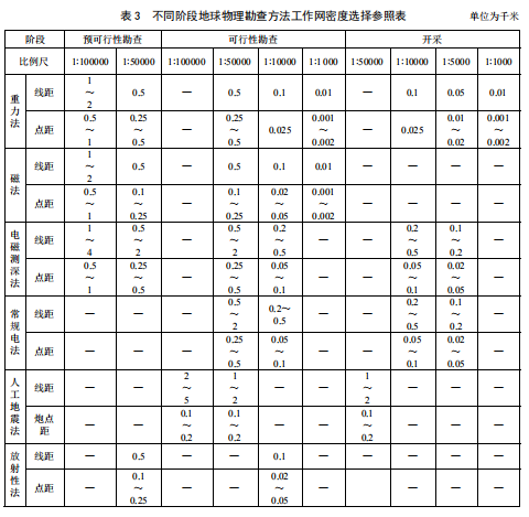h) 地球物理方法實(shí)物工作量應(yīng)滿足相應(yīng)比例尺(參見表 3)及探測深度要求;后續(xù)涉及鉆探工作的應(yīng)有異常驗(yàn)證和再解釋的設(shè)計(jì)內(nèi)容。