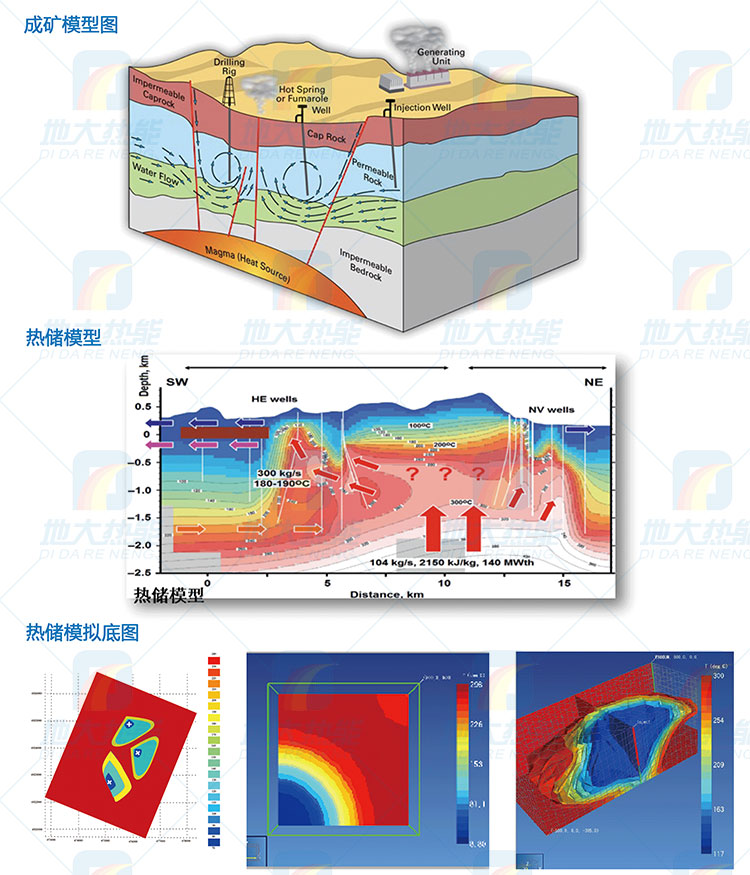 ⑤根據地質、地球物理、地球化學、錄井、試井等資料,建立熱儲模型,預測熱儲開采動態(tài)及開發(fā)時期可能獲得的產量,熱田地質環(huán)境變化,最終建立地熱田開發(fā)利用的優(yōu)化管理模型。