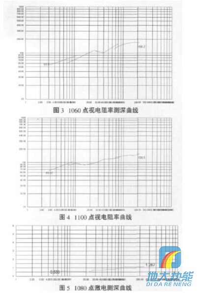(2)在100線1060、1100點上進行電阻率測深, 從二個點的曲線形態(tài)來看,曲線形態(tài)相似且地層分層明顯;70~200m層位穩(wěn)定,基本為砂巖(見圖3~4)。