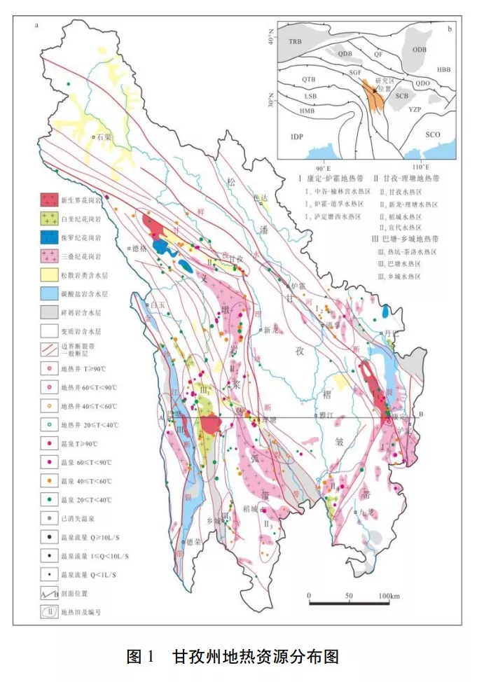 據(jù)最新調(diào)查成果,甘孜州的水熱活動強(qiáng)烈,全州共有溫泉點264 個,地?zé)峋?/a>17 口, 除色達(dá)縣外,其余17 縣均有水熱活動。 全州溫泉分布主要受 3 條深大斷裂帶和數(shù)條主要大斷裂(德格-鄉(xiāng)城大斷裂帶、玉科大斷裂帶、 陳支大斷裂帶等)控制,形成了3個主要地?zé)釒?/a>和9個水熱活動集中分布區(qū)的基本分布格局。水熱活動強(qiáng)烈區(qū)一般位于主干斷裂帶及其轉(zhuǎn) 折的部位,以康定縣、甘孜縣、理塘縣、巴塘縣 為典型代表。