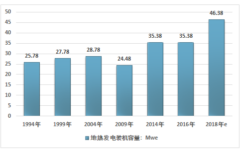 截止2018年年底,中國地區(qū)地?zé)岚l(fā)電累計裝機(jī)約46.38MWe。