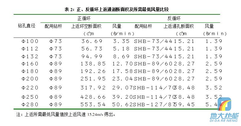 基巖水井通常口徑為Φ160~Φ280mm之間,該口徑硬巖的鉆進(jìn)效率低,成本高,施工周期長,成為鉆探界亟待解決的難題。20世紀(jì)70年代開始,我國已引進(jìn)潛孔錘技術(shù)應(yīng)用于水井鉆鑿,鉆進(jìn)效率數(shù)倍提高,展示了潛孔錘鉆進(jìn)的良好前景。但水井工程,孔深大,背壓高,配套使用的空壓機(jī)不但風(fēng)量要求大,風(fēng)太也高,使鉆進(jìn)成本大幅度增高。主要矛盾是滿足排渣屑上返風(fēng)速的要求時(shí),供風(fēng)量巨大,遠(yuǎn)超過了潛孔錘本身工作的需求。計(jì)算不同孔徑條件下滿足上返風(fēng)速15m/s供風(fēng)量的需求,見表1(Φ89鉆桿為例)。表1數(shù)據(jù)表明,孔徑越大,為滿足排渣屑要求而消耗的能量越大,經(jīng)濟(jì)性越差。若實(shí)施反循環(huán)鉆井技術(shù)工藝,則排渣屑所需風(fēng)量大大減小,如表2所示。