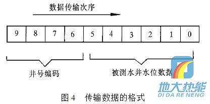 現(xiàn)在通過單片機輸出控制一組由三極管組成的電子開關(guān),由電子開關(guān)代替按鍵功能完成數(shù)據(jù)輸入.例如:要傳輸十進制數(shù)據(jù)0,1,2,3,4,5,6,7,8,9,單片機依次輸出接通雙音頻編碼器輸入數(shù)字按鍵0,1,2,3,4,5,6,7,8,9對圖4 傳輸數(shù)據(jù)的格式應(yīng)的電子開關(guān)的控制信號,則該組數(shù)據(jù)經(jīng)雙音多頻編碼器轉(zhuǎn)換為雙音頻信號. 雙音多頻編碼器在單片機控制下,定時“撥通”水位監(jiān)測中心電話號碼,在水位監(jiān)測中心計算機應(yīng)答并“摘機”的情況下,通過這條已接通的電話線路,將所測的水位數(shù)據(jù),經(jīng) 過雙音多頻編碼器編碼后傳送到監(jiān)控中心. 要傳輸?shù)臄?shù)據(jù)格式為:數(shù)據(jù)長度為10位十進制數(shù),其中高四位為井號編碼,低六位為所測量的水井水位數(shù)據(jù),水位數(shù)據(jù)分整數(shù)和小數(shù)兩部分.數(shù)據(jù)傳輸?shù)姆较蚴菑母呶坏降孜?數(shù)據(jù)格式如圖4所示.