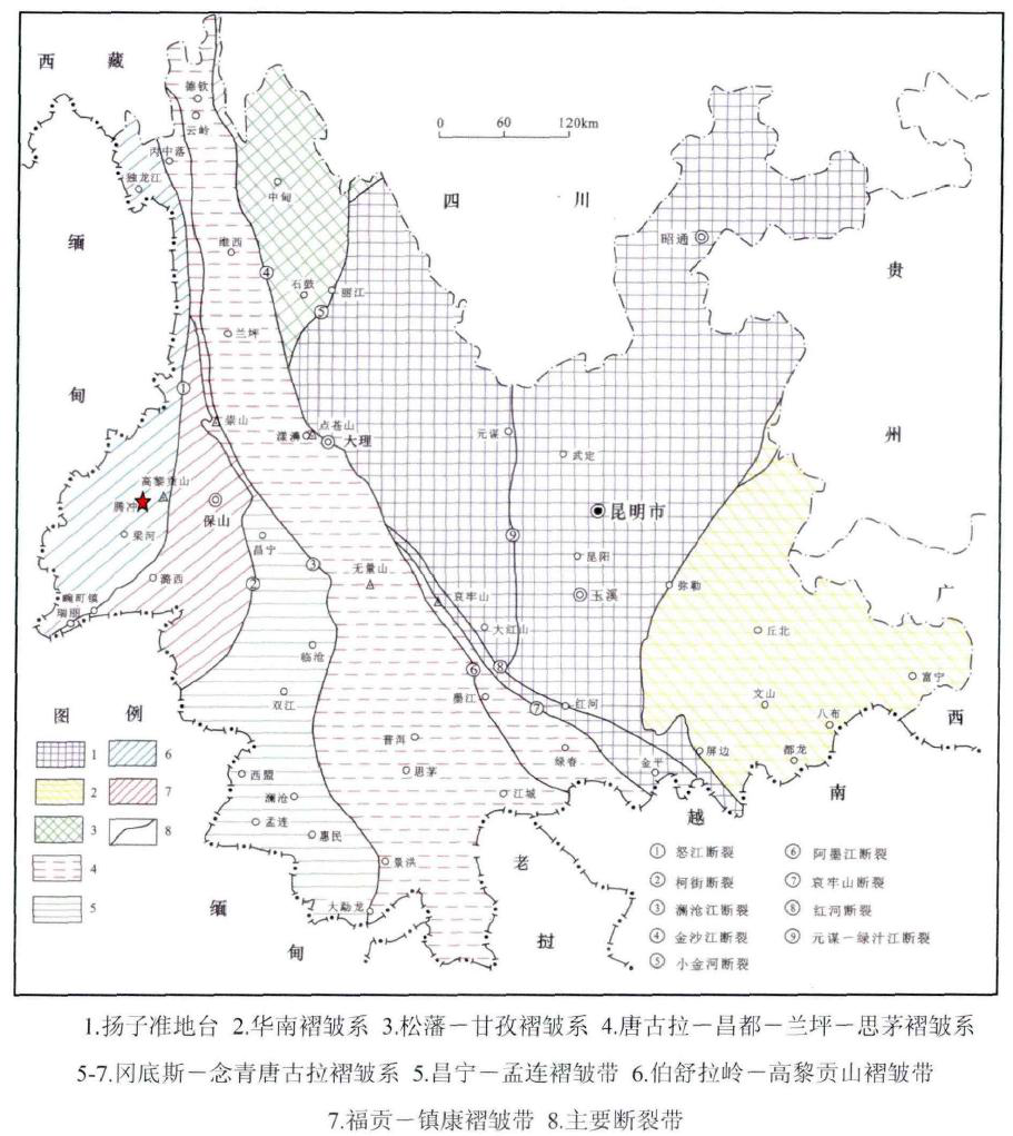 圖1 云南騰沖縣地理位置圖 2.項(xiàng)目區(qū)地質(zhì)背景 騰沖縣位于高黎貢山西側(cè),總體地勢(shì)北高南低,山脈走向?yàn)楸睎|一西向及南北向,與區(qū)域構(gòu)造線(xiàn)基本一致。高黎貢山與怒江并列向南蜿誕,高黎貢山峰脊一線(xiàn)海拔多在3000m以上;而怒江河谷海拔僅500—900m,區(qū)內(nèi)最高峰為高黎貢山中段的大腦子,海拔3780.9m;最低點(diǎn)為盈江縣拉沙河與穆雷江交匯處,海拔僅210m;最大高差達(dá)3570.9m,一般高差在400—2000m之間,屬中高山中一深切割地區(qū)。縣城西側(cè)為高中山地貌景觀(guān),谷深坡陸;東側(cè)為中山山地稍為平緩,但切割密度較大;中部為斷陷谷地,河流階地發(fā)育,地勢(shì)平坦開(kāi)闊。騰沖地區(qū)構(gòu)造運(yùn)動(dòng)活躍、斷裂構(gòu)造發(fā)育、巖漿活動(dòng)頻繁、火成巖分布廣泛、新生代火山活動(dòng)、現(xiàn)代水熱活動(dòng)異常強(qiáng)烈,溫沸泉眾多。