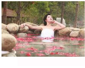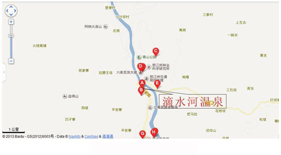 云南滴水河溫泉風景滴水河溫泉以泉群形式出露,出水點散布于滴水河河床及河漫灘上,地表為第四系礫石、砂等沖洪積物覆蓋,滴水河溫泉出露特征高程與躍進橋溫泉和瑪布河溫泉不同,其出露高程為1502.3m,相對較高。 |
